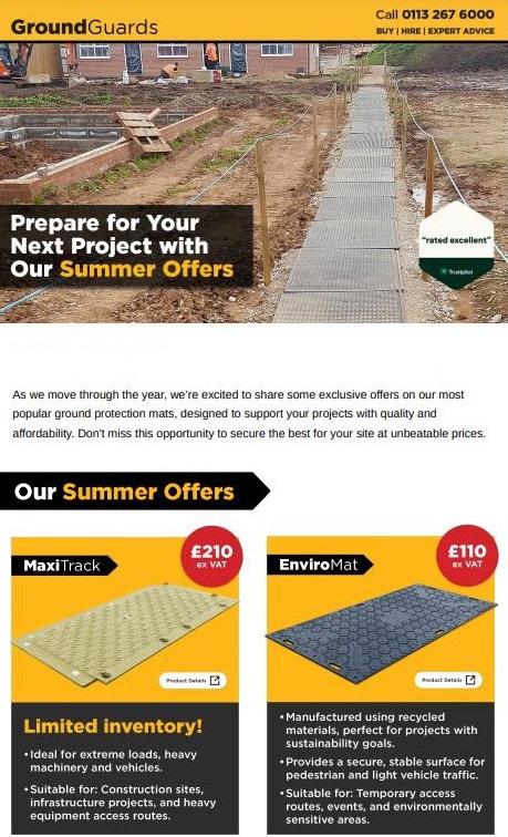 For over 20 years Ground-Guards has been a market leader in providing ground protection solutions to a wide range of sectors across the UK, including construction, civil engineering, utilities, energy, local authorities, sport and leisure, events and more. Their range of high quality, durable and reusable ground mats are used to create temporary roadways, walkways and access roads to protect turf during periods of maintenance activity.